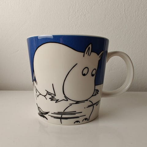 Myynnissä tuotannosta poistunut Arabian muumimuki Muumipeikko jäällä. Muki hyvässä kunnossa. Ei näkyviä valkoisia pisteitä tai tummumia.