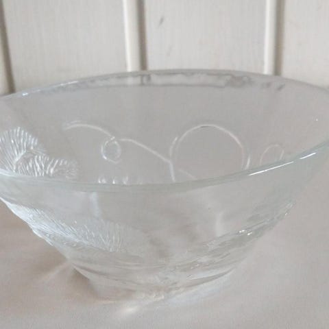 Nuutajärven lasin Pioni-sarjan lasiastia, esim. hedelmäkulho. Halkaisija n. 20 cm. Design Oiva Toikka.