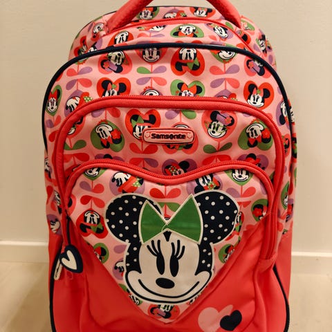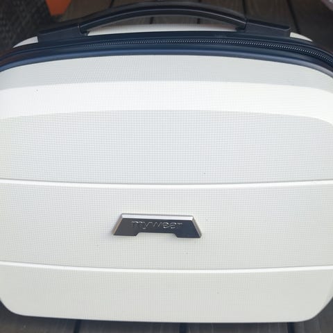 Minni matkalaukku. Kovapintainen, säädettävä vetokahva, pyörät alla.