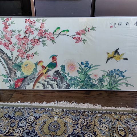 Kiinalainen lohikäärme - taulu, jossa sinisen ja valkoisen sävyt sekoittuvat. Taulun pinta on eläväinen ja siinä on kolmiulotteisia elementtejä. Lohikäärme kiiltäväpintainen ja tausta matta. Huom. Lohikäärmeen evät on rakennettu lasinosista, joten saattavat sisältää teräviä kohtia. Ei suositella lasten tai lemmikkien ulottuville.