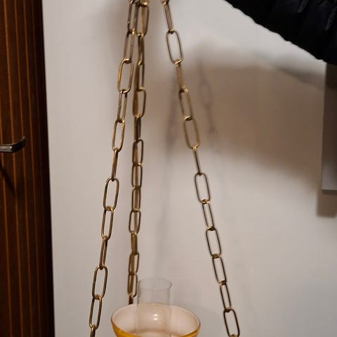 Kai Finnmarkin suunnittelema kattovalaisin 1970-luvulta, valmistaja suomalainen Lynx. Korkeus säädettävissä kolmella metalliketjulla. Messinkiä ja muovia. Halkaisija noin 40cm. Ajanmukaista kulumaa ja naarmuja, mutta ei mitään huomattavaa vikaa.