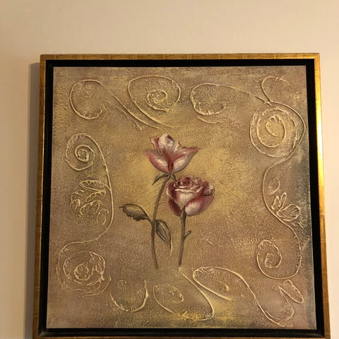 Taulu, jossa on kultainen lootuskukka sinisellä taustalla.