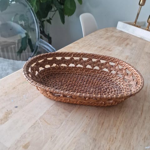 Aikanaan Pentikiltä ostettu kori. Pituus noin 40cm, leveys 30cm. Pohjasta muutama säle hieman kärsinyt, mutta muuten ehjä ja siisti.