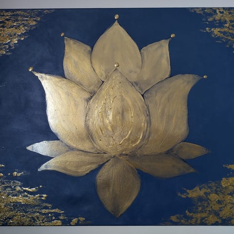 Taulu, jossa on kultainen palmun lehden kuva tummansinisellä taustalla.