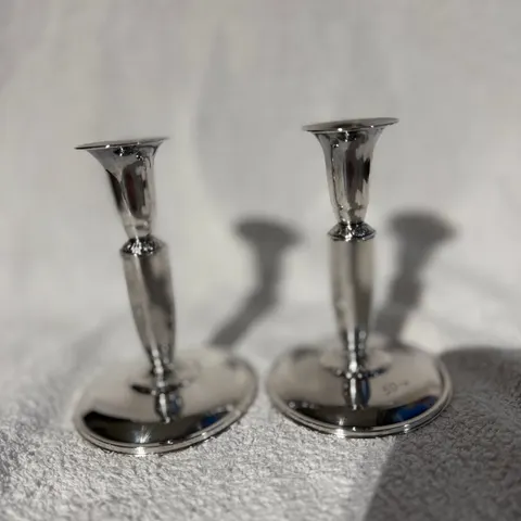 Hopeiset kynttilänjalat, leimat on. Korkeus on 13,5cm, eli hyvän kokoiset. Sopivat sisustukseen ja kynttilöiden käyttöön. Hinta yhteensä 185€.