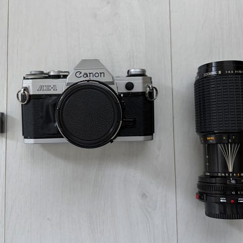 Kamera+Canon lens Fd50 1:1,8 , Hoya HMC zoom 80-200 1:4 ja Rollei salama Beta 4