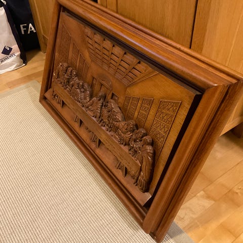 Vanha taulu, jossa on puukaiverrus lintukuvioista. Taulun materiaali on puu, ja se on kehystetty. Taulu soveltuu seinäkoristeeksi.