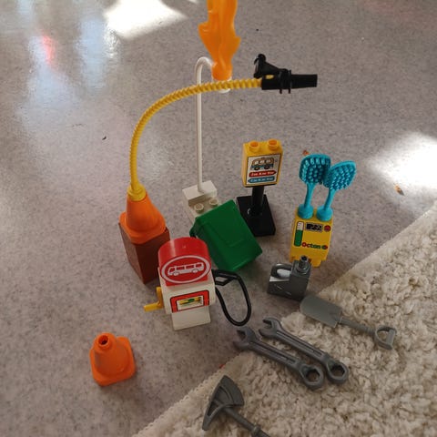 Myydään siistikuntoinen rakennussetti, jossa rakennuspalikat/alusta on Lego duplosarjaa ja ajoneuvot on Lidlin rakennussarjaa.