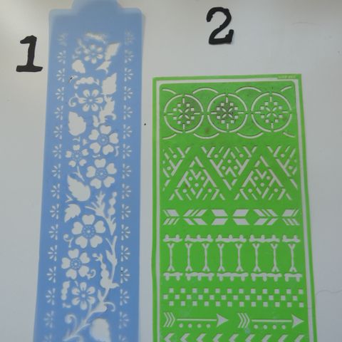 Stensiilit, numerot 0-9 ja kaikki kirjaimet aakkosista löytyy, muutamassa kirjaimessa valkoista maalia kun käytetty mutta ei haittaa käyttöä,