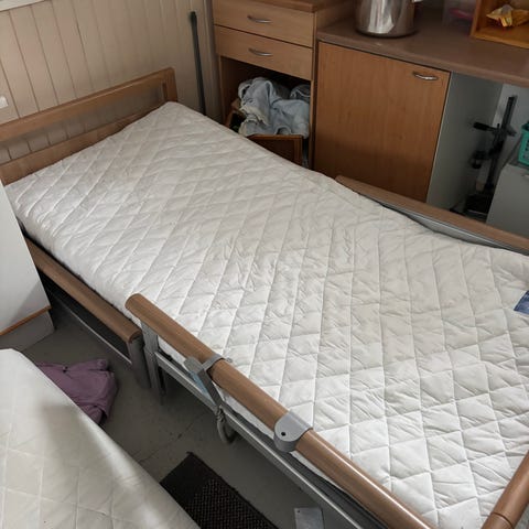 Käytetty, mutta toimiva hoitosänky. Leveys on 80 cm, korkeutta voi säätää ja pituudesta en ole varma, kuitenkin aikuisten kokoa.