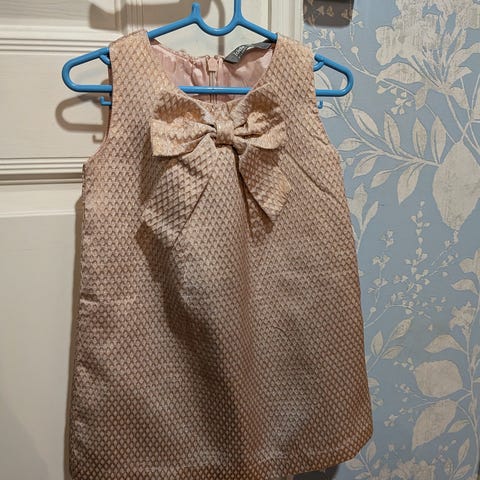 H&M:n kaunis rusettiaiheinen mekko kokoa 92 cm. Siisti, ehjä ja tahraton. Kaunis kullanvärinen vetoketju takana.
