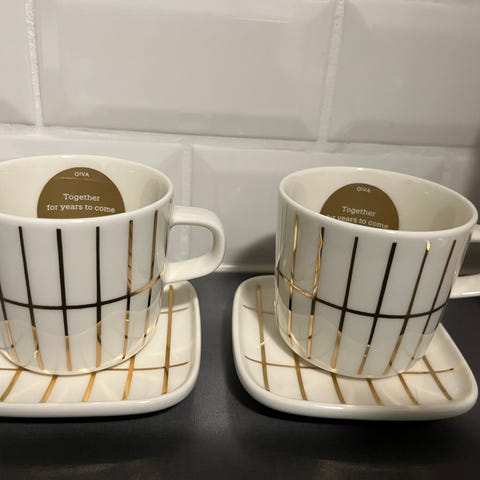 Marimekko mukit ja lautaset, joissa on kultainen viivakuviointi. Sarja sisältää kaksi mukia ja kaksi lautasta, jotka sopivat esimerkiksi kahvi- tai teehetkiin.