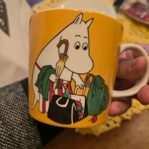 Käyttämätön Muumimamma aprikoosi muki tarralla.
