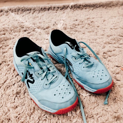 Yhdellä lapsella salibandyssä olleet kengät. Tuo valkoinen kangasosio taitaa tässä värissä aina vähän tummua. Huomaa kyllä, että ovat käytetyt, mutta eivät mistään rikki.