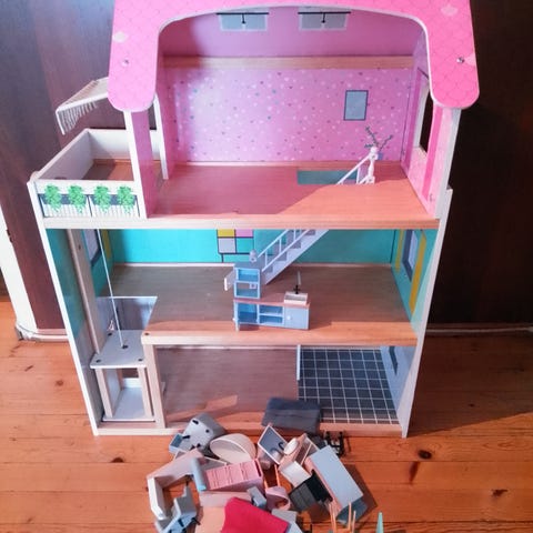 Vähän leikitty nukkekoti ja kuvassa näkyvät kalusteet. Joitain käytönjälkiä on, mutta tosi siisti kuitenkin. Katto aukeaa molemmilta puolilta, keskellä saranat.