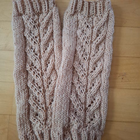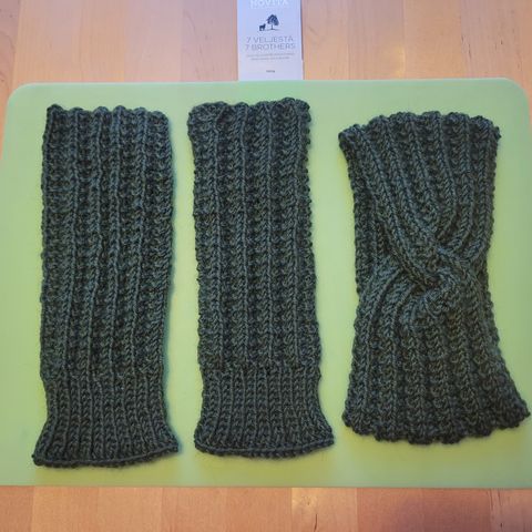 Käsinkudotut valepalmikolla ranteenlämmittimet. Novita 75 % villa - 25 % polyamidi. Korkeus 21,5 cm ja leveys 8 cm.