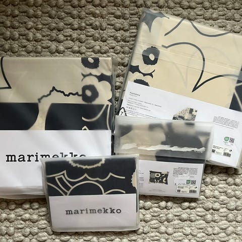 Kerran pestyt ja hetken aikaa käytössä olleet marimekko unikko pussilakanat ja tyynyliinat. Molempia on 2kpl. Kreppipuuvillaa. Ovh 322€.