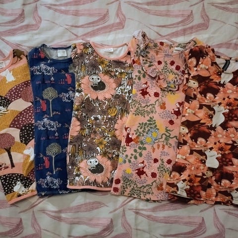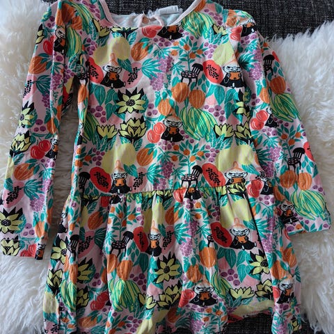 Muumit lasten mekko, koko 110, punainen väri, kuvioitu kuviolla.