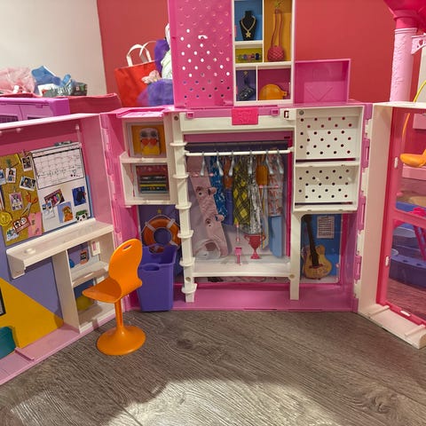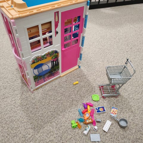 Keittiö, jääkaappi, pinnasänky, lipasto, kylpyamme, sänky lapsibarbielle, moottorikelkka ja kypärä.