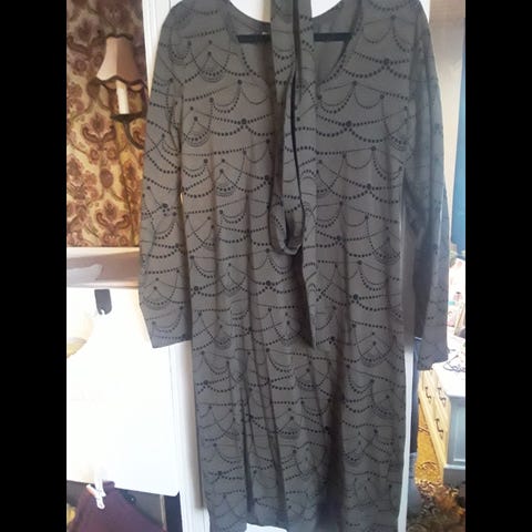 Mekko juhla-kuosilla. Takana vetoketju. Koko L. Ehyt ja siisti. 25 €.