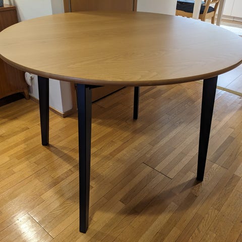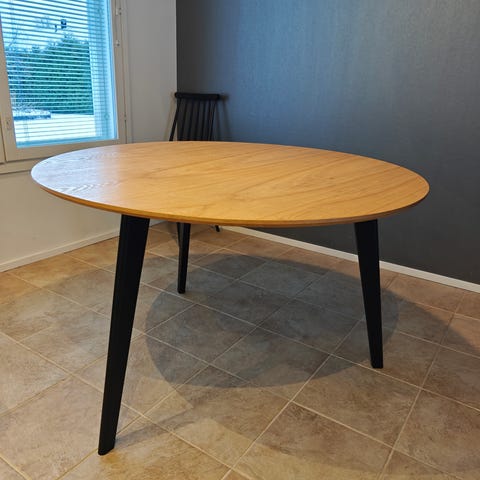 Puiset pinnatuolit on maalattu vahamaisella maalilla ja ne ovat kuluneet rouhean kauniiksi. Kummastakin löytyy elämisen jälkeä. Ikean Liatorp pyöreän pöydän saa jatkettua niin, että neljän sijasta pöydän ääreen mahtuu kuusi. Pöydän kansi heiluu hiukan kiristyksestä huolimatta ja kannessa myös jälkiä. Ruuvien uusinta mahdollisesti auttaisi.