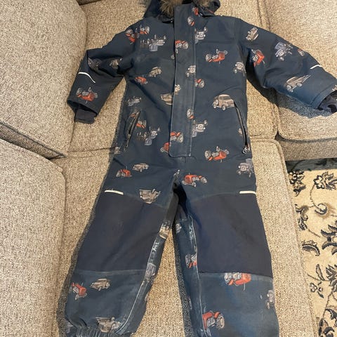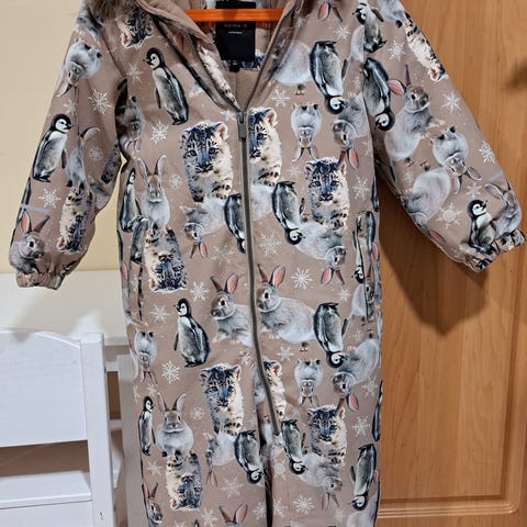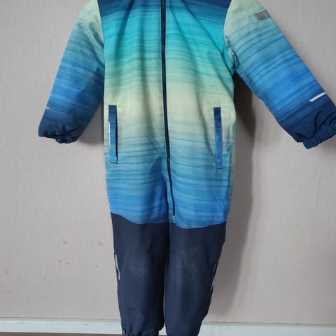 Yhden talven kovasti käytetty haalari. Polvissa selkeää ohentumaa ja toisessa polvessa minireikä (läpi päälykankaasta). Myös pepussa ohentumaa, muttei siinä määrin kuin polvissa.