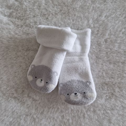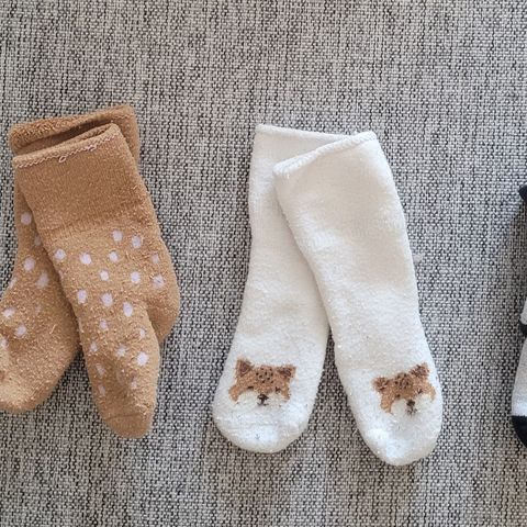 3 paria lämmintä H&M frotteesukkaa jouluteemalla ja 2 paria ohutta Lupilun puuvillasukkaa. Kokomerkintää en löytänyt mutta olivat meillä käytössä noin 3-6kk ikäisellä. Paikoin reilusti pesunukkaa, mutta ovat täysin ehjiä ja siistiä. Sopivat hyvin kotisukiksi ennen kuin jalka ehtii kasvaa seuraavaan kokoon. 😊