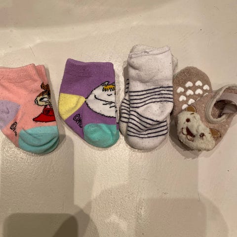 3 paria lämmintä H&M frotteesukkaa talviteemalla ja 2 paria ohutta Lupilun puuvillasukkaa. Kokomerkintää en löytänyt mutta olivat meillä käytössä noin 3-6kk ikäisellä. Paikoin reilusti pesunukkaa, mutta ovat täysin ehjiä ja siistiä. Sopivat hyvin kotisukiksi ennen kuin jalka ehtii kasvaa seuraavaan kokoon. 😊