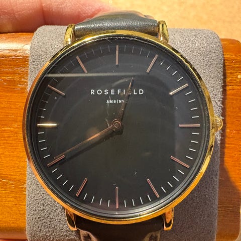 äyttämätön Rosefield rannekello. Kellotaulun väri musta,rannekello ruostumatonta terästä,väri ruusukulta.