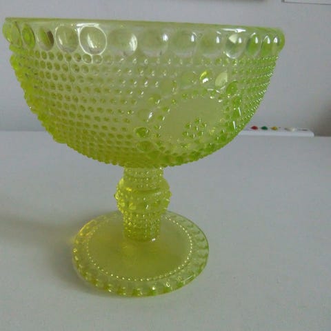 Keltaista uraanilasia. Iso kulho korkeus 7,5 cm, halkaisija 20 cm. Pieni kulho korkeus 6 cm, halkaisija 12 cm. Virheettömiä, olleet vain lasivitriinissä koristeena. yhteishinta 110€.