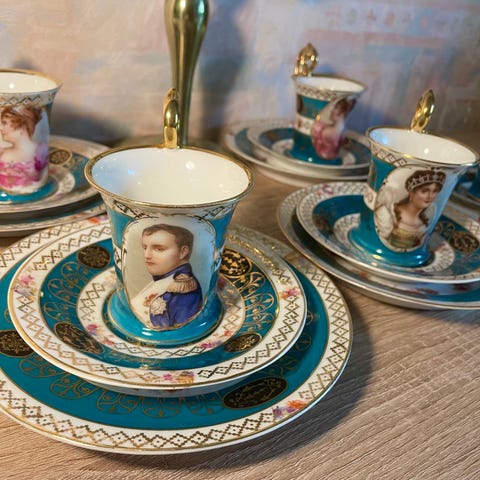 Harvinaisuus tarjolla - upea kuninkaallisen loistokas tarjoilusetti Ranskasta. Muutamia riksuja, tarjottimessa yksi ja isossa kupissa yksi, tulleet varmaankin jo aikoja aikoja sitten. Tästäpä näyttävä setti vaikkapa Joululahjaksi.