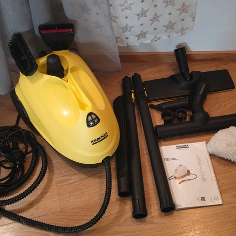 Muutaman kerran käytetty ja pitkään säilytetty höyrypesuri. Osat ja käyttöohje mukana. Lisäksi vesisäiliön kalkinpoistoon tabletit. (avaamaton paketti).