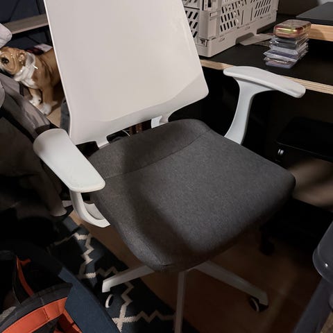 Muuten hyväkuntoinen työtuoli, mutta kissa kynsinyt tekinahkaosuutta. Korkeussäätö toimii.