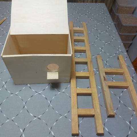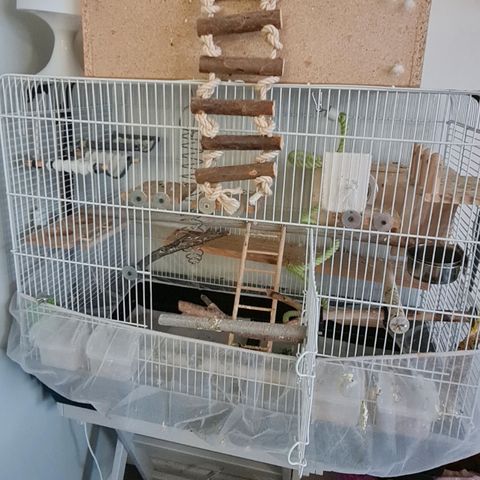 Puinen lintujen leikkikeskus, jossa erilaisia tikapuita, keinuja ja leluja lintujen aktivointiin ja liikunnan edistämiseen.