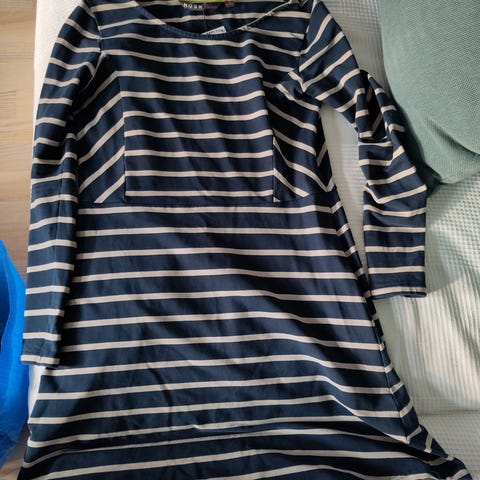 Raidallinen Nosh trikoomekko/tunika, koossa M (38/40). Ehjä ja pesty hajusteettomalla pyykinpesuaineella. Edessä taskut.