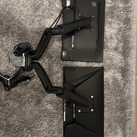 Selling complete dual display setup with two 24-inch displays and desk stand.