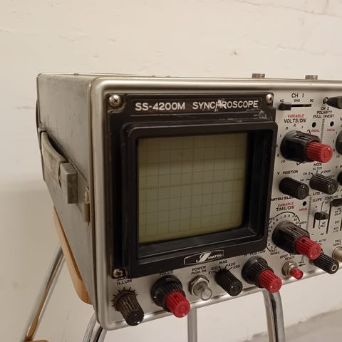 100 Mhz 2-kanavainen analogiaskooppi yleismittarilaajennuksella. Pikaisesti testattuna skooppi toimii, kirkkautta on runsaasti eikä mitään palojälkiä kuvassa.