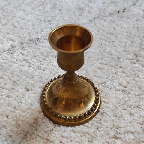 Vanha messinki kynttilänjalka, jossa on laakea alusta ja sormilenkki kantamista varten. Sopii käytettäväksi pöytäkynttilöiden kanssa.