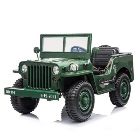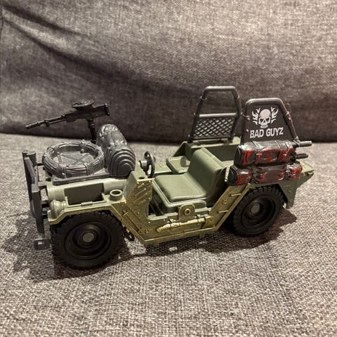 Jeep Wrangler leluauto punaisena ja sitä vetävä matkailuvaunu ruskean ja valkoisen sävyissä. Sopii leikkeihin ja lasten mielikuvitusleikkeihin.