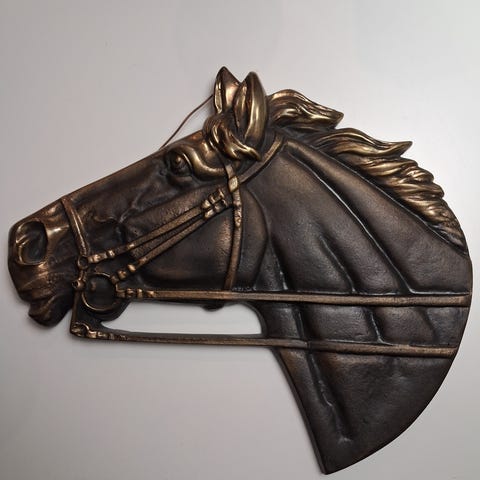 Valurautainen hevosenpää. Korkeus n.63 cm, painava. Muutamaa kohtaa pintakorjattu maalilla.