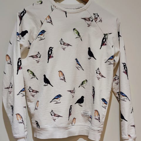 Kotimaisen Riva Clothingin (nykyisin Toive) lintuaiheinen college-paita xs-koossa. Materiaali 100% puuvillaa. Nouto Lauttasaaresta tai postitus.