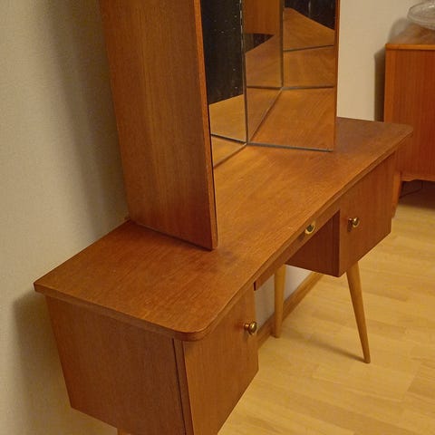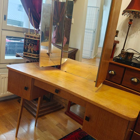 Vintage peilipöytä 60-luvulta. Sivupeilit kääntyvät ja koko peiliosan saa pois nostamalla niin halutessaan. Kauniisti kaartuva etureuna ja pyöreät jalat.