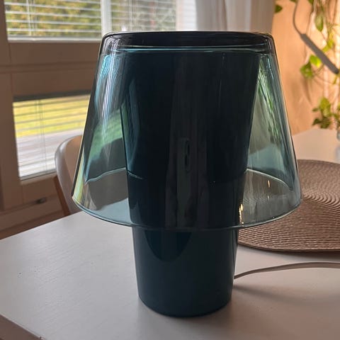Kuvan mukainen vintage Ikea Iviken -valaisin. 90-luvulta. Ehjä ja toimiva. Pientä kellastumaa jalustan kumiosissa, niin kuin näissä tahtoo olla. Mukaan led-polttimo, joka ei tähän ehkä ihan optimaalisen näköinen ole. Nouto Oulun Hiukkavaarasta.