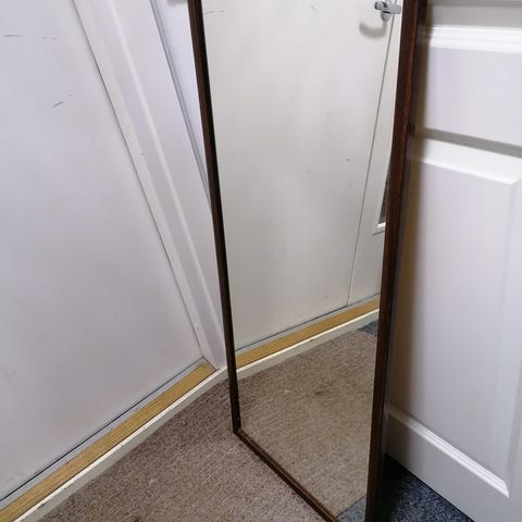 Kapea malli sopii hyvin eteiseen, makuuhuoneeseen tai pieneen tilaan. Kehys aitoa puuta, tumma petsaus. Lasi 3mm float-lasi. Ripustus valmiina naru (seinälle). Mitat noin 100×40cm, mutta kuvista löytyy tarkentavat mitat. Kunto hyvä käytetty. Kehyksessä pientä ajan patinaa, ei halkeamia. Valmistaja Finnmirror/TSL (merkintä takana)
