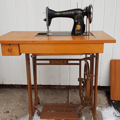 Vanha Singer ompelukone, jossa puinen pöytä ja metallinen jalusta. Kotelo löytyy