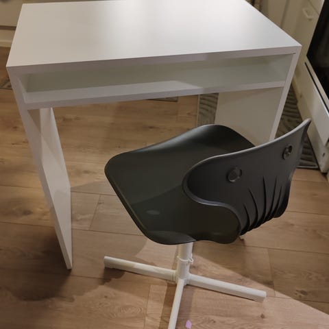 Ikeasta pöytä, käy myös Kallaxiin kiinnitettynä lisä osilla. Jalat irroitettavissa. Työtuoli myös ikean normaalikokoinen. Nouto Hyrylä keskusta