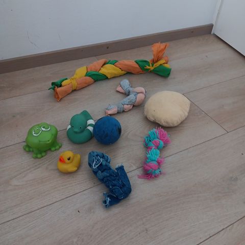Erilaisia koiran leluja - kaikki käyttämättömiä, mutta vähän karvaa/pölyä voi olla, kun seisseet lelulaatikossa. Mikään näistä ei ole superkestävä tehojärsijälle, vaan tavallisia koiran leluja. Mielellään kaikki, mutta yksittäinkin käy.