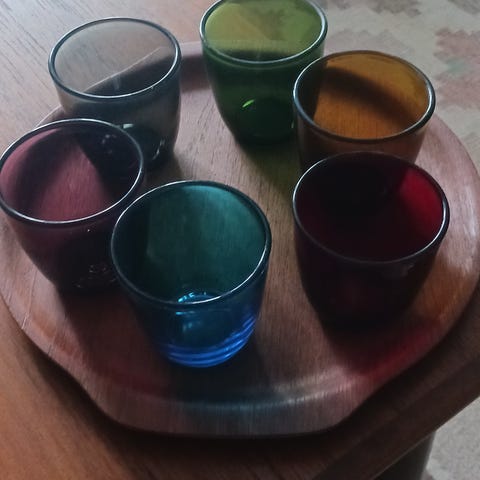 Kaksi lasia 1960-luvulta. Karhulan lasitehdas valmisti näitä sinappipurkeiksi. Monet käyttivät näitä myöhemmin juomalaseina. Hyvässä kunnossa ikäänsä nähden.