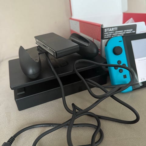 Nintendo Switch pelikonsoli, jossa on punaiset ja siniset Joy-Con -ohjaimet. Konsolin kunto on hyvä, näytössä pientä jälkeä ja dpad on vasemmalla hieman kulunut, muuten erinomainen kunto.
