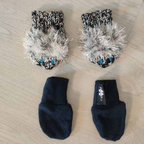 Vekkuli Kekkuli vauvan käsineet. Oman arvioni mukaan päällinen puuvillaa ja vuori merinovillaa tai merinovillasekoitetta. Kaunis siilikuvioinen kangas. Toisen tumpun vuorissa reikiä, ks. kuvat. Reikien vuoksi kuntoluokitus kohtalainen.